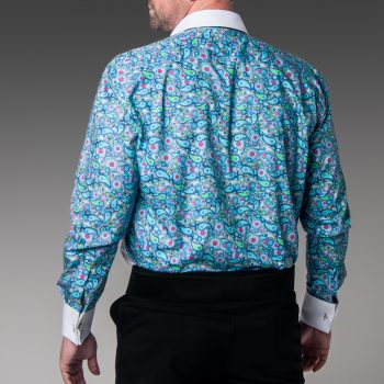 Features: 100% Cotton pique front panel, classic collar with double cuff with blue paisley pattern on the arms and reverse.